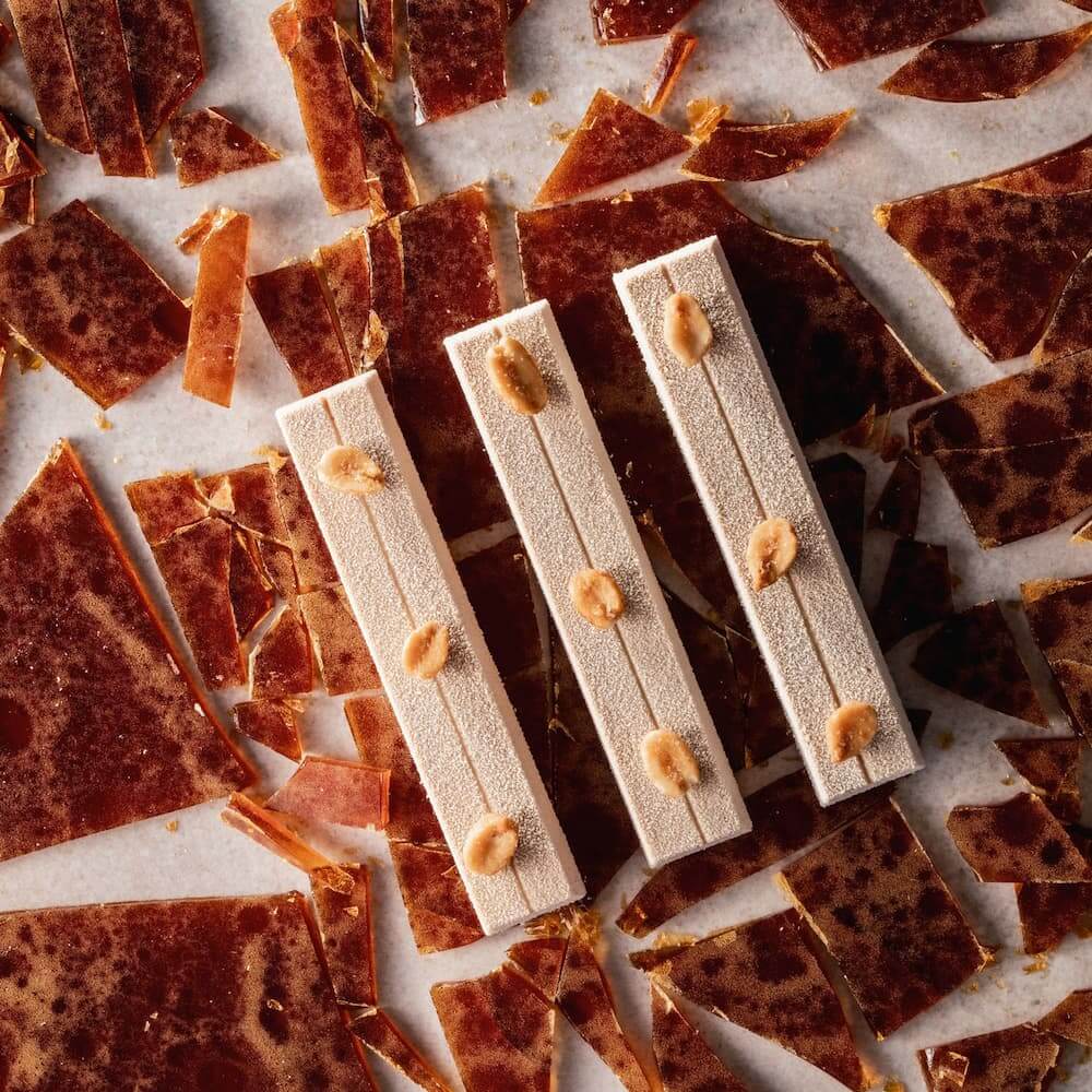 Spread into a 17 mm frame. Allow to set up overnight at room temperature. Cut into 15 mm x 80 mm pieces. Partially enrobe with pre-crystallised milk chocolate Callebaut® Select 823NV. Garnish with Callebaut® Crispearls™ Dark CED-CC-45CRISP.
