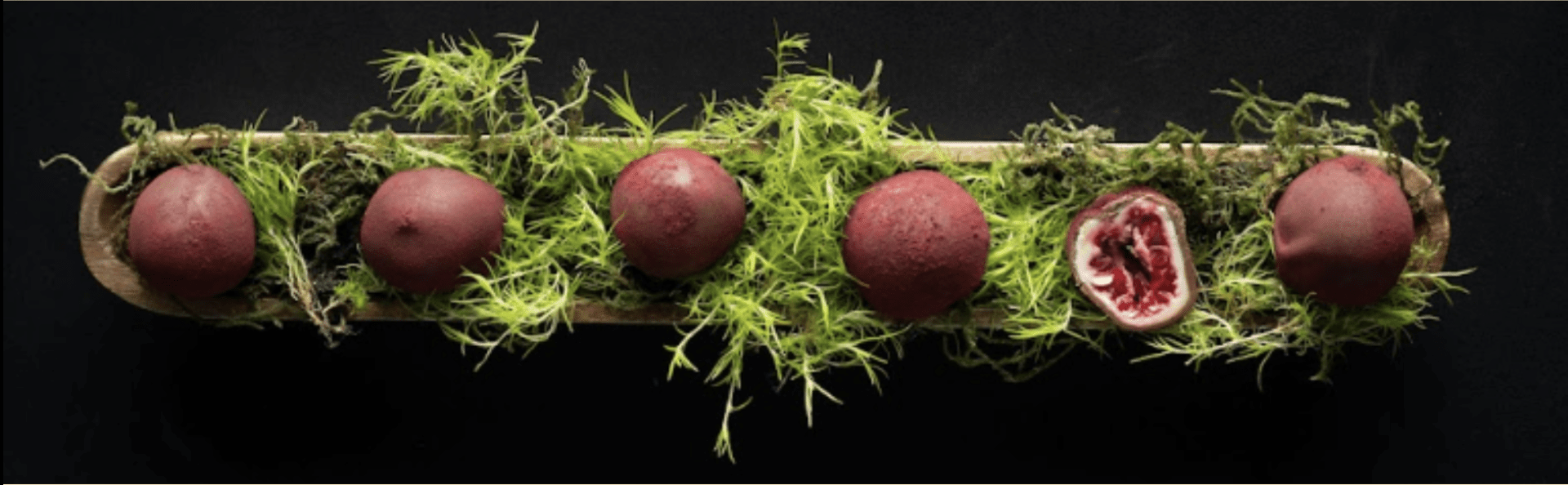 Křupavé mražené maliny obalené v lesklé temperované čokoládě. Dokonalá rovnováha svěží ovocné kyselosti a bohaté čokoládové chuti. Tip: Čokoláda při kontaktu se zmraženým ovocem rychle houstne – pracujte rychle. Postup potahování (clean & bold): Maliny vyjměte z mrazáku těsně před použitím. Vložte je do vytemperované čokolády a jemně protřepejte, aby se rovnoměrně obalily. Vyjměte pomocí vidličky nebo sítka a nechte okapat přebytečnou čokoládu. Položte na pečicí papír nebo silikonovou podložku. Ihned vraťte do mrazáku, aby čokoláda ztuhla.