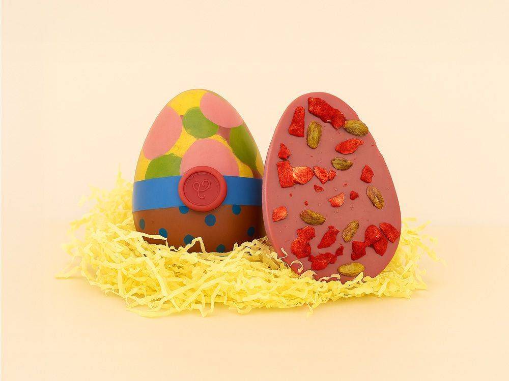 Elegantní velikonoční vejce ze tří čokolád s kontrastními a zároveň se doplňujícími vrstvami: skořápka z hořké čokolády Callebaut Dominican Republic přináší pevné, kakaově výrazné křupnutí; hedvábně jemné pistáciové křupnutí z mléčné čokolády Callebaut Ghana dodává krémovou plnost bez přehnané sladkosti; a jahodová ganache z Callebaut Ruby RB2 nechává vyniknout živé ovocné tóny. Jak vysvětluje šéfcukrář Devin Cowan: „Profil Ghany přináší krémovost a komfort tradiční mléčné čokolády. V kombinaci s RB2 může její ovocnost zazářit, aniž by ji přebila. Když přidáte 70% hořkou čokoládovou skořápku, vznikne na patře kontrastní chuťový zážitek.“ Finální úprava — kůra z RB2 posypaná pistáciemi, sušenými malinami a fleur de sel — čistě spojuje poloviny a zvýrazňuje ovocno-oříškové aroma, zatímco skladování při 8–16 °C udržuje texturu křupavou a chutě svěží pro dárky i prodej.