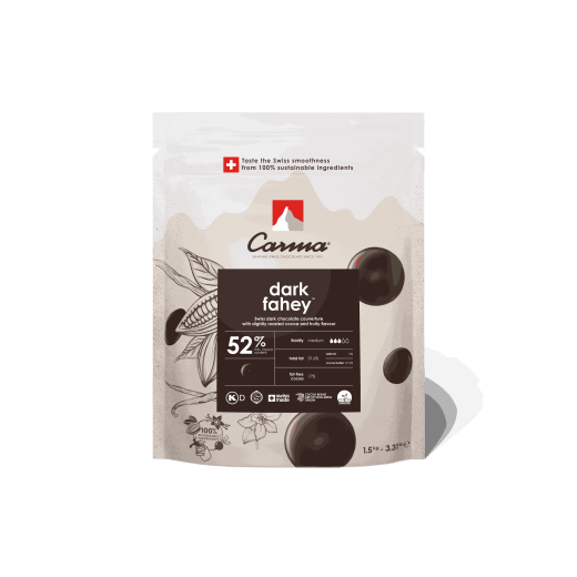 Dark Fahey in eine rechteckige Form gießen. Mandelbiskuit entsprechend zuschneiden und aufsetzen. Dark Fahey-Ganache in kleinen Spitzen aufspritzen und mit Gurkengelee verzieren. Beliebig mit Schokoladendekor verzieren.