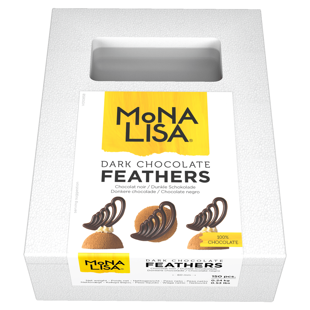 Dark Chocolate Feathers (L: 60 mm) sind dünn und runden Ihre Kreationen auf elegante Weise ab. Diese Dekore eignen sich optimal auf Brandteig, Éclairs und Eiscrème. Die Packung enthält 150 Stück; wir bieten dieses Dekor auch in einer Packungsgröße mit 500 Stück.