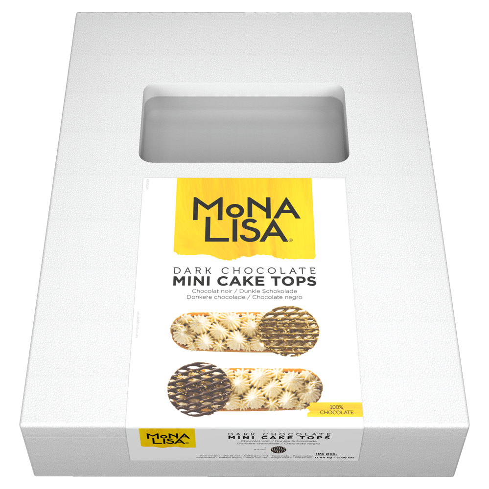 Dark Chocolate Mini Cake Tops (D: 50 mm) haben eine solide Gitterstruktur, mit denen Sie Ihren Kreationen eine neue Dimension geben können. Dieses Gitter eignet sich optimal auf Plätzchen, Gebäck oder sogar Eiscrème. Sehen Sie sich auch die anderen Tortengitter im Mona Lisa „Shape“-Sortiment an!