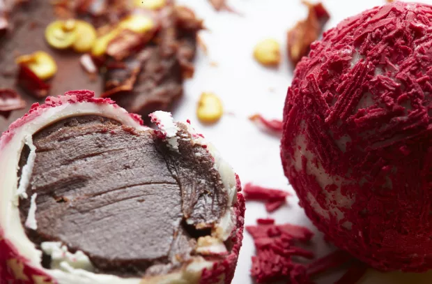 The interior of a brightly-colored truffle with a thick shell