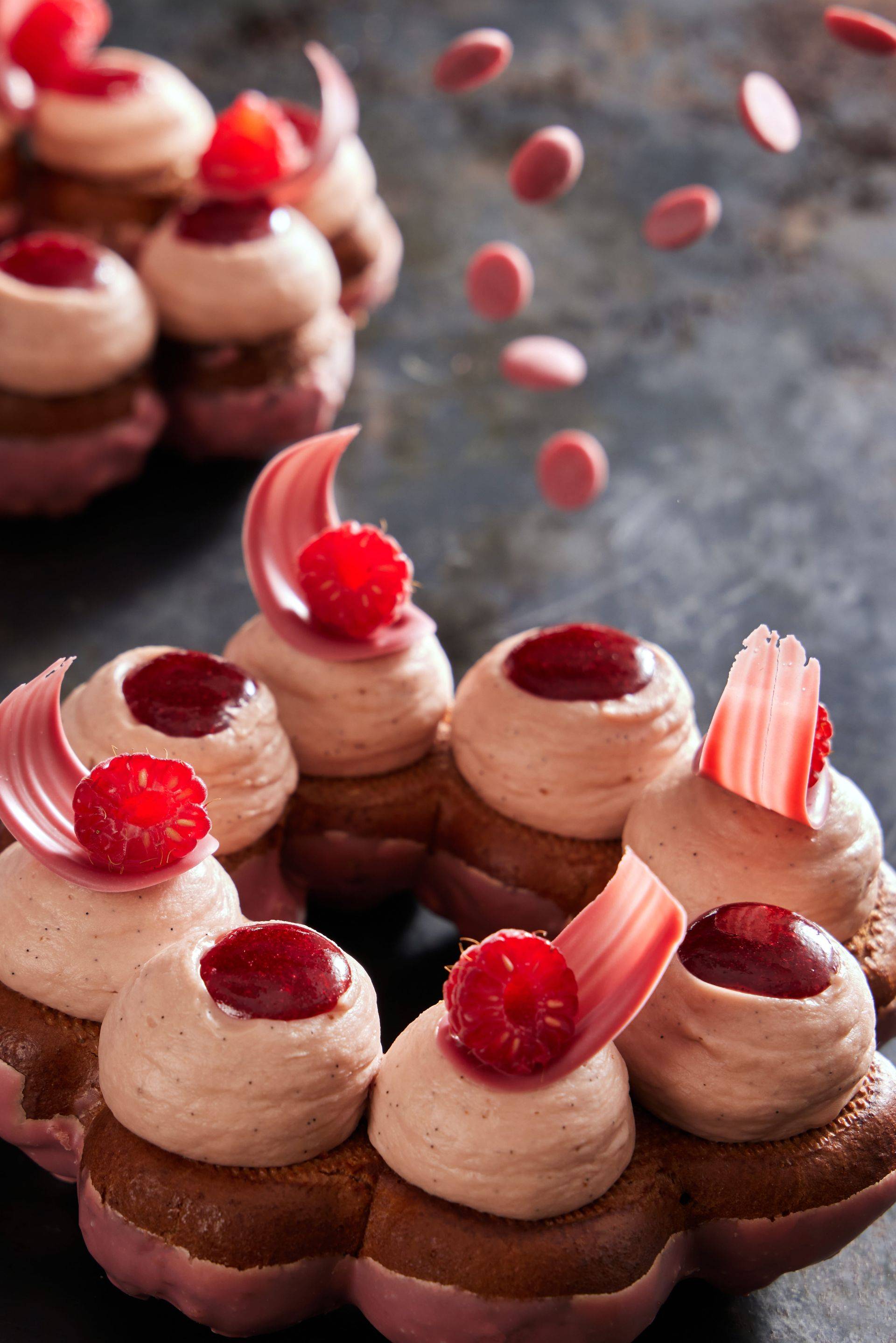 Classic pastries will always be among my favorites.  The Ruby Raspberry Pistachio Paris-Brest is a classic pastry that combines different techniques, textures, and flavors to celebrate and sweeten our lives. The Cacao Barry Plein Arôme cacao powder gives a strong chocolate flavor to the dough. The Callebaut Ruby RB2 gives a unique flavor to the cream as well as a smooth texture. The Cacao Barry Pistachio praline spread gives the dessert a flavor and texture that contrasts with the smooth textures and fresh flavors of the cream.