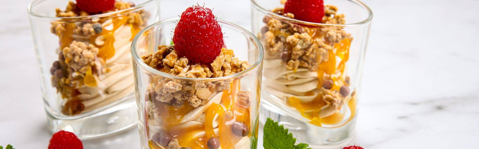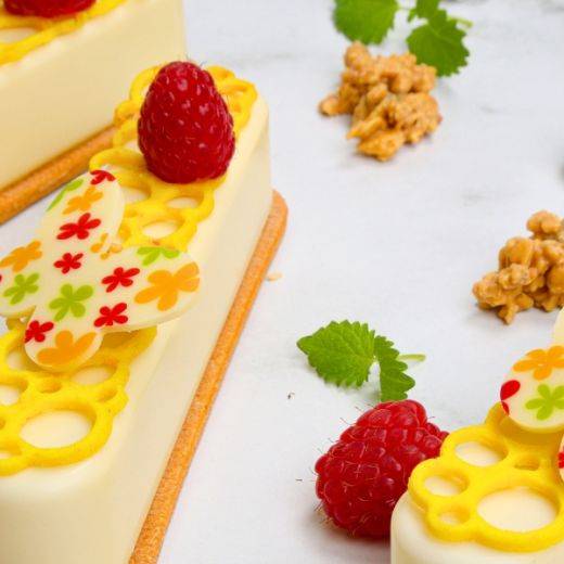 A crunchy summer dessert with a fresh compliment from the tangy pineapple and fantastic depth from the caramel sauce. A taste explosion that is tamed by a whipped GOLD chocolate ganache.