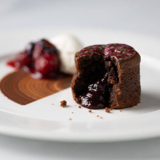- Transfer to a piping bag and portion 3oz into prepared ramekins, placing a ganache truffle in the center of each lava cake.