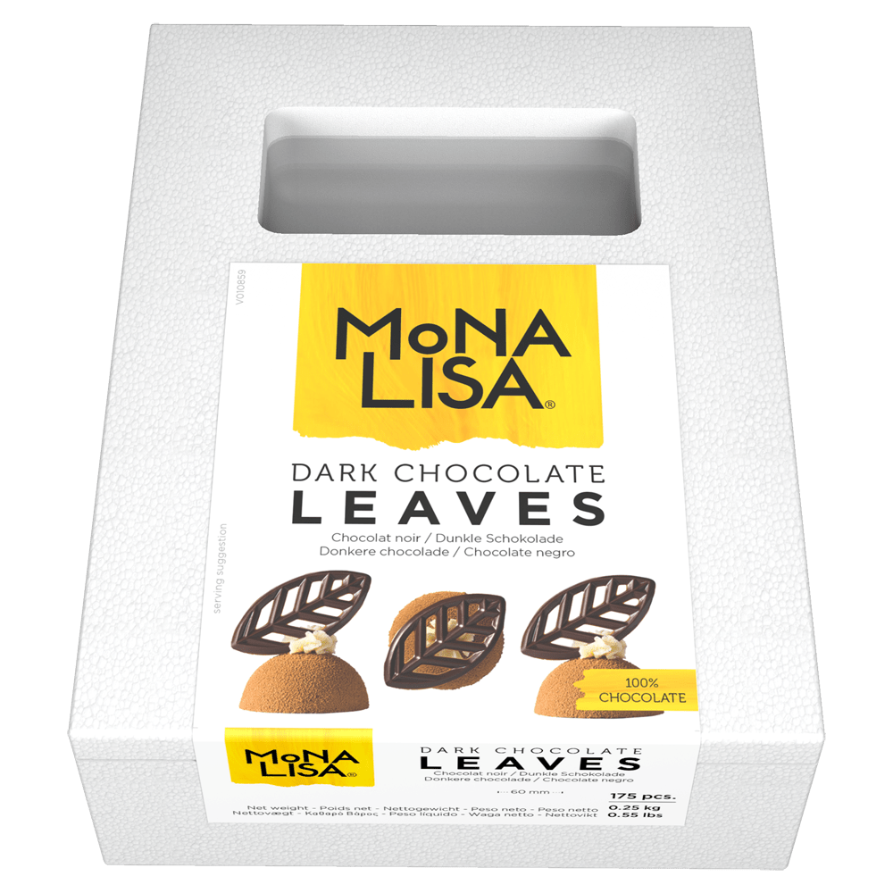 Dark Chocolate Leaves (L: 60mm) are thin with a sharp finish. These decorations can be used on choux, éclairs and ice creams. This pack contains 175 pieces; we also offer this decoration in a pack 550 pieces.