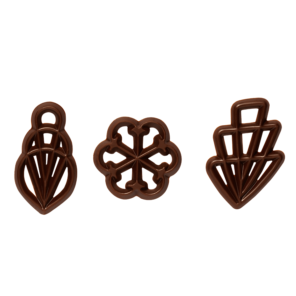 Assortment of three signature chocolate decorations. Apply them on desserts and pastry, and on any surface, such as glazing, marmalade or crème.