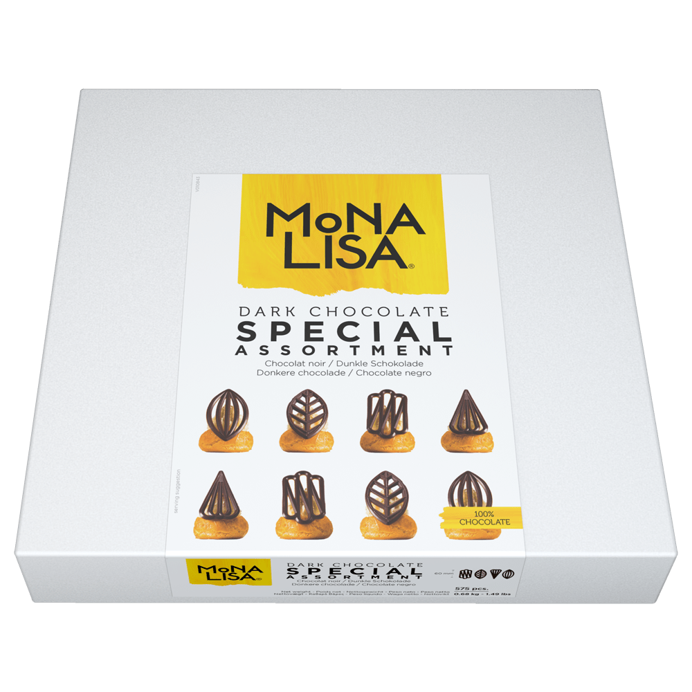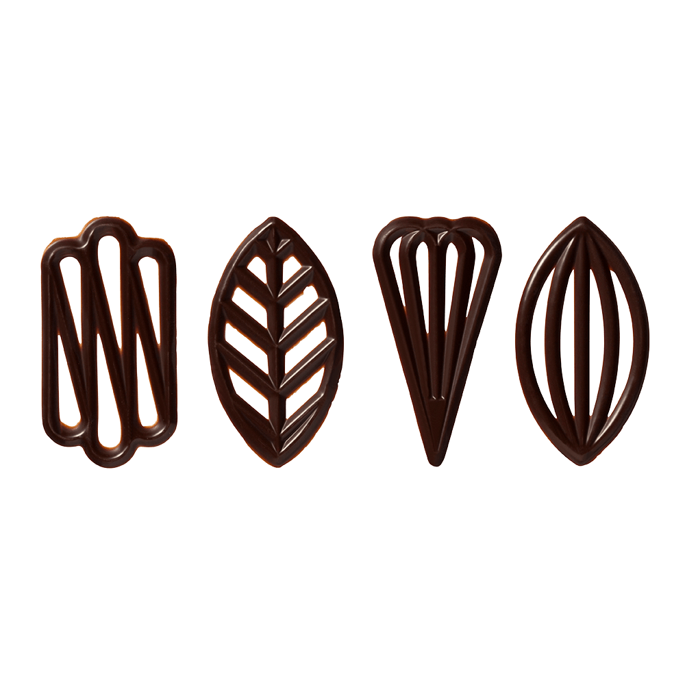 With the fine Dark Chocolate Special Assortment of 4 (L: 60mm) decorations you can add unique shapes to your creations. These decorations can be used on choux, éclairs and ice creams. The pack contains 575 pieces; we also offer this decoration in a pack of 195 pieces.