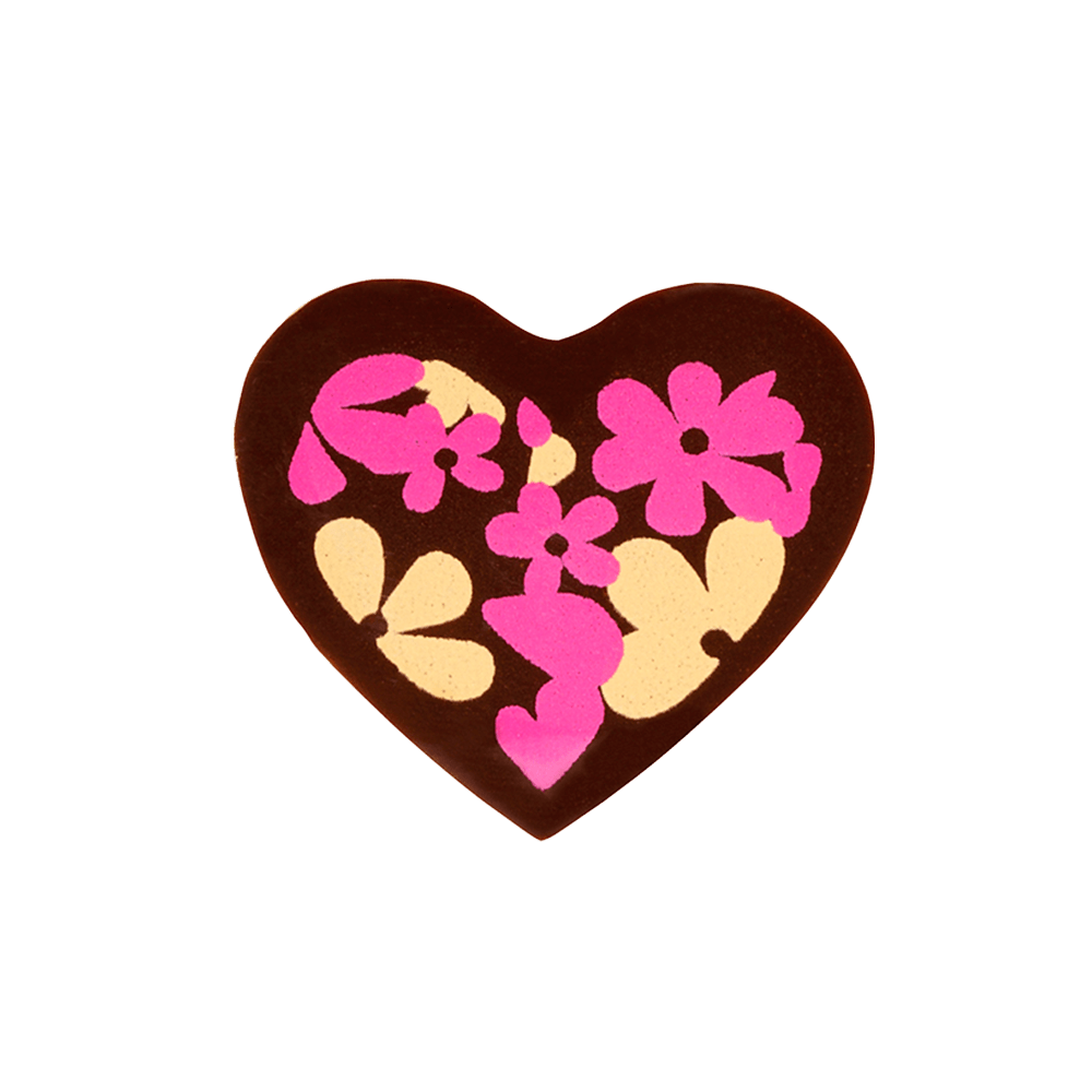 Pink and cream flowers printed on a thin dark heart. This cute 22mm diameter decoration can be placed on top of éclairs, cupcakes and small pastries to brighten creations
