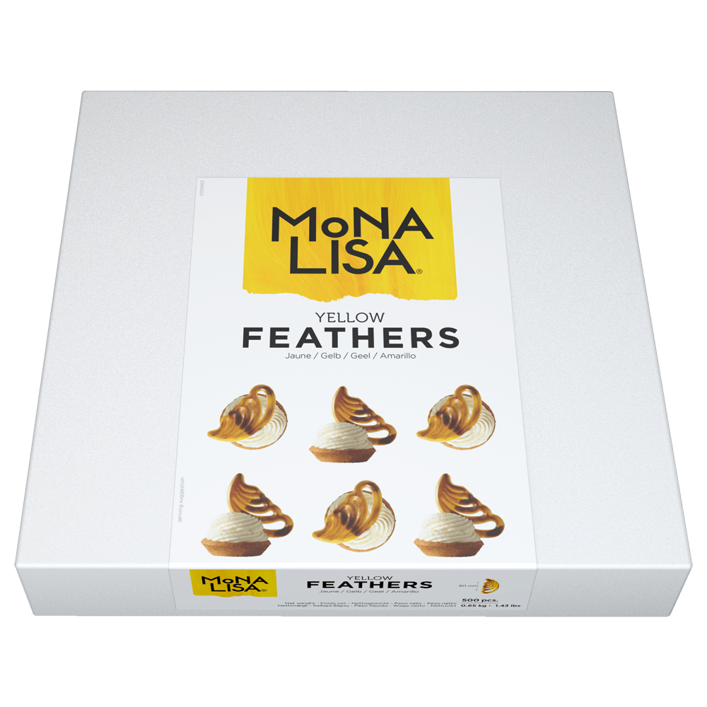 Our thin Marbled Yellow Feathers (L: 60mm) give your creations an elegant finish, whilst also adding colour. They can be used on choux, éclairs and ice creams.