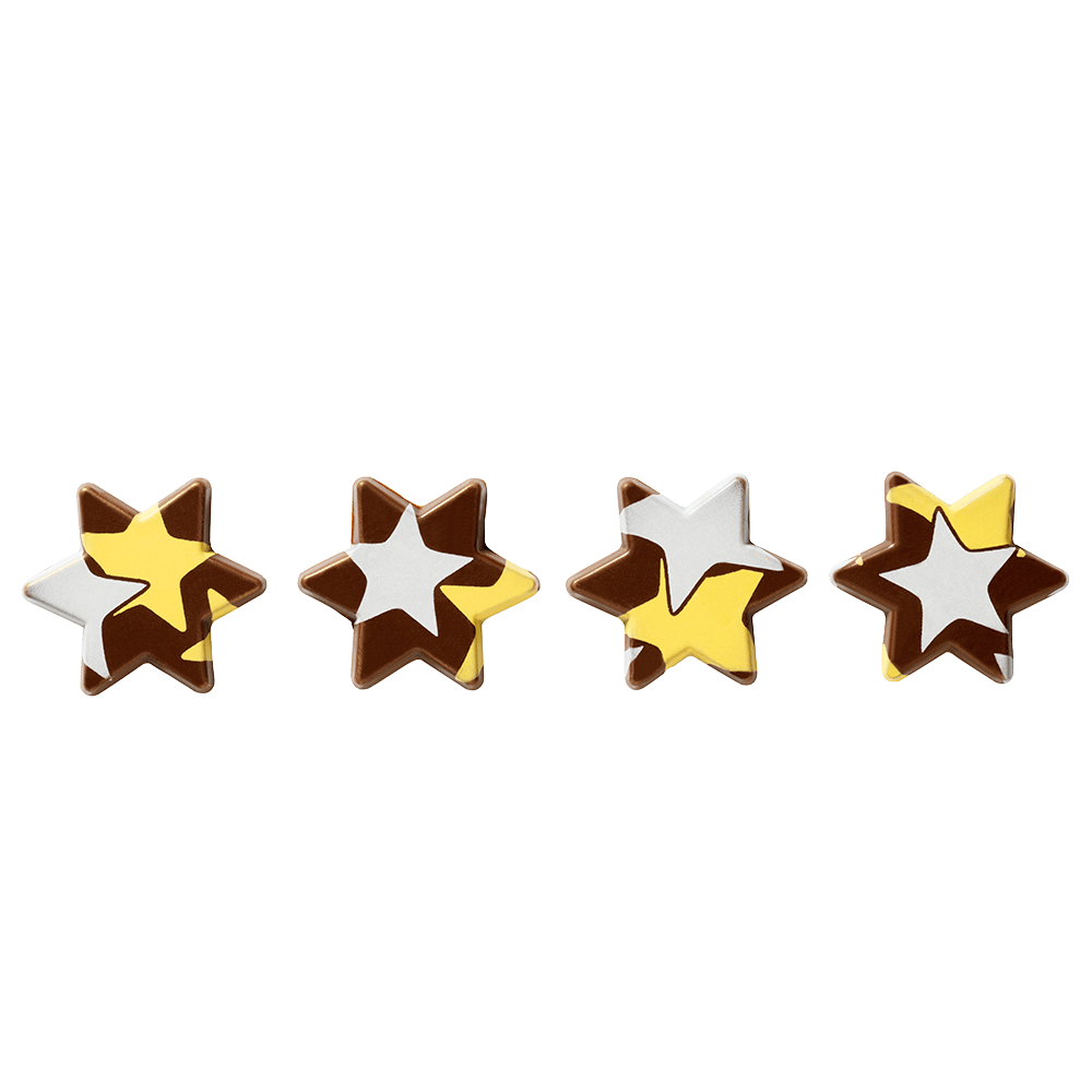 Dark stars (L: 32, W: 36, H: 3mm) with a gold and silver print to add a modern festive touch to your creations. These decorations could be used on pastries, chocolate logs, and individual desserts. Perfect for both Christmas and New Year's celebrations.