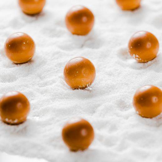 - Place the bonbon with the shiny side facing upwards into pre-crystallized milk chocolate.