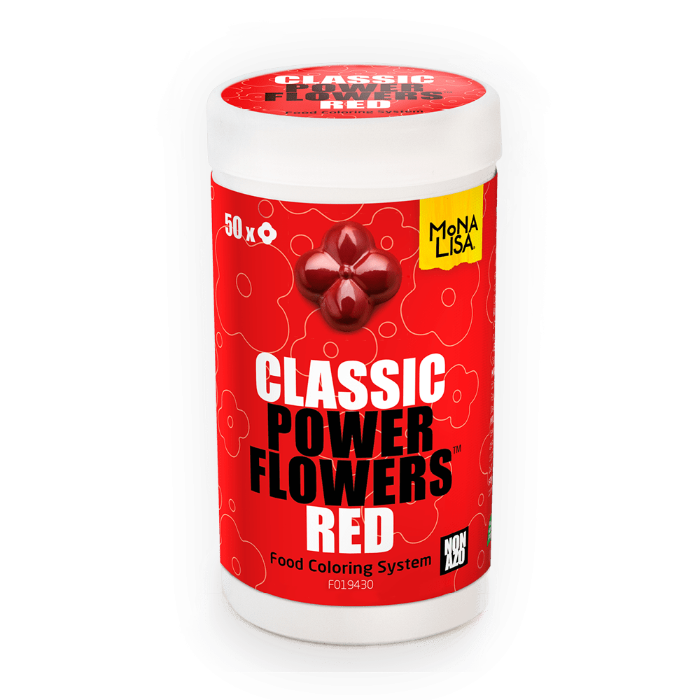 Classic Power Flowers Red. Red food color Non-AZO (E120) and TiO2-free. Can be used to color any fat-based recipe. 50 grams. Tip for Christmas. Tip for Valentine's Day