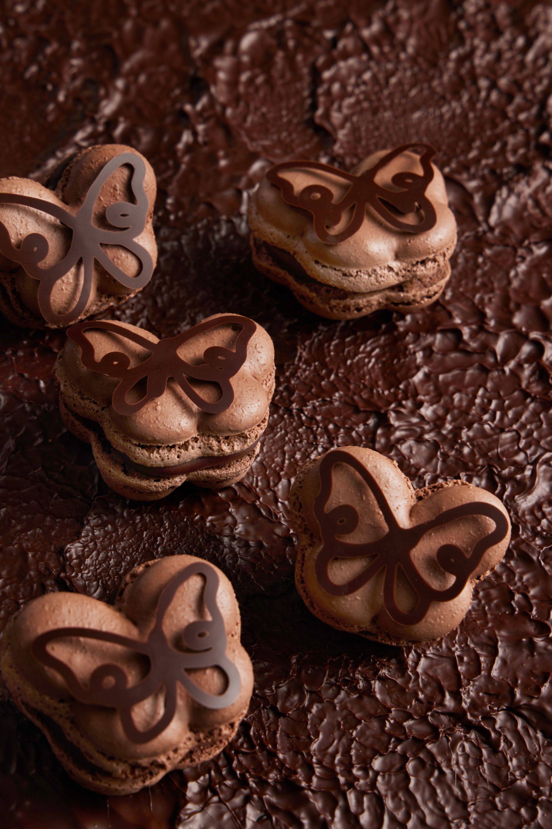 The butterfly symbolizes lightness; the 70% Dominican cacao brings intensity perfect harmony in a single macaron. I love the slight red tones and floral notes that come from the Callebaut Zestina Pleine Arome Cocoa Powder. The Callebaut Dominican Republic Origin Chocolate has some beautiful red fruit notes, a little acidity and some tropical fruit notes that I wanted to highlight with a ganache that is made soleylw ith water as the base.