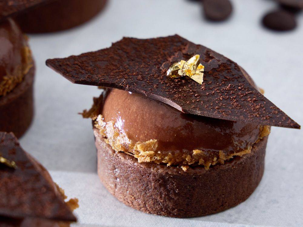 A bright, nostalgic tart built on cacao pâte sucrée and layered with kumquat confit, Fleur de Cao mousse, and a fragrant bergamot–orange blossom glaze. The tropical, yellow‑fruit notes of Callebaut Rustic Fleur de Cao inspired Chef Georgios Mouzelis to recreate the flavors of his childhood — kumquats, bergamots, and the perfumed blossoms from his grandmother’s garden. As he shares: “Callebaut Rustic Fleur de Cao's tropical, yellow fruit notes reminded me of the fruits that grew in my grandmother's garden… This tart is an homage to her.”