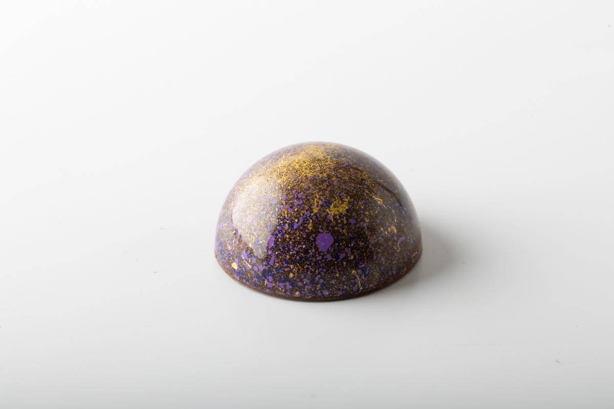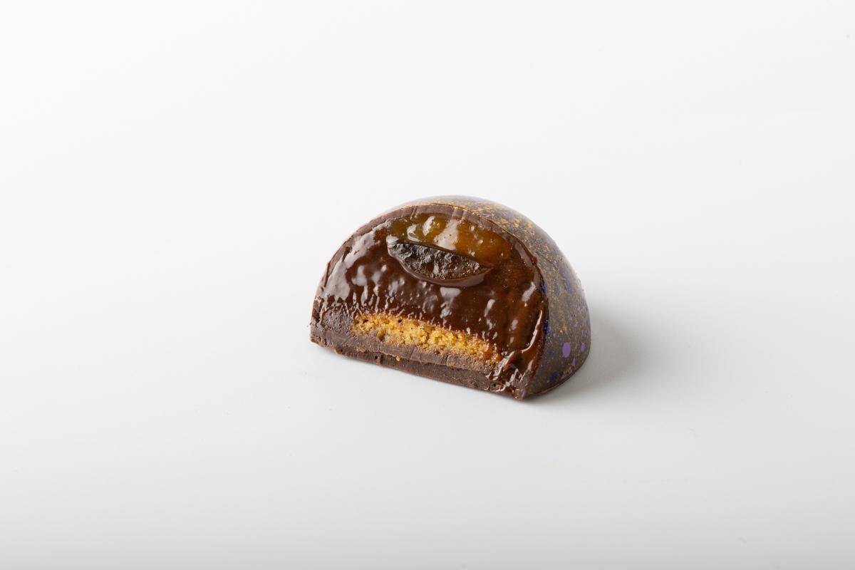 Callebaut 811 Dark Chocolate bon bon filled with a Bergamot Caramel Fudge, Pink Grapefruit Pate de Fruit, Earl Grey Ganache, Sable Breton