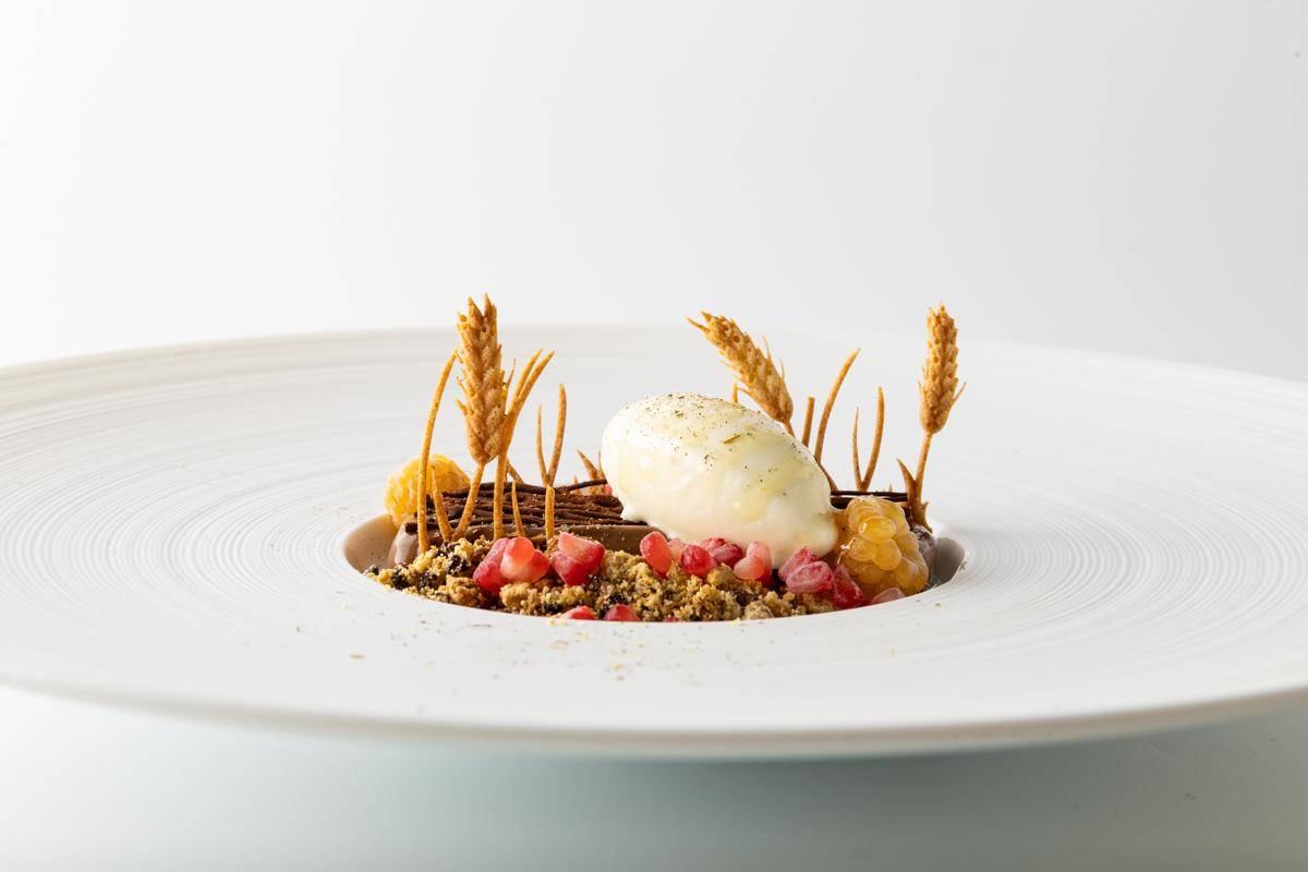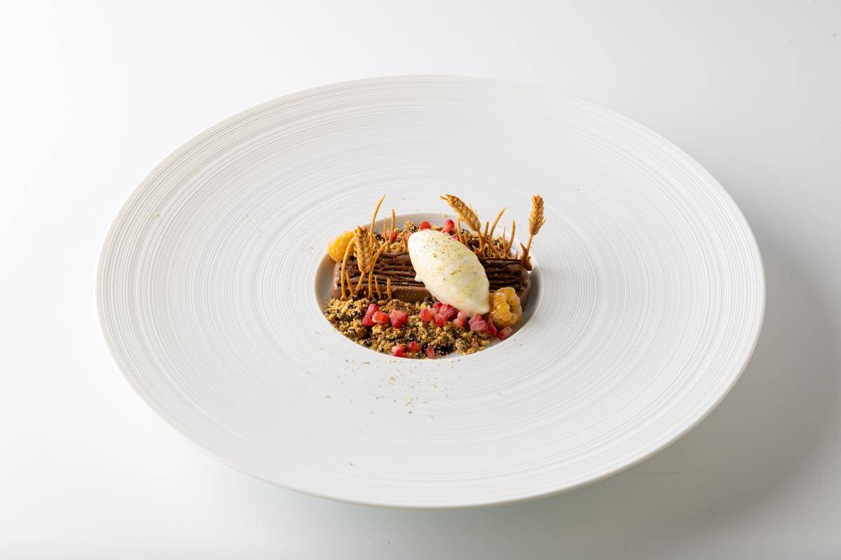 Milk Chocolate Cremeux, Milk Chocolate, Malt and Grue Crumble, Buckwheat Tuille, Wild British Berry Puree, Glazed Jersey Honey Yellow Raspberries, Parsnip Ice Cream, Chocolate ‘root’ and Meadowsweet.