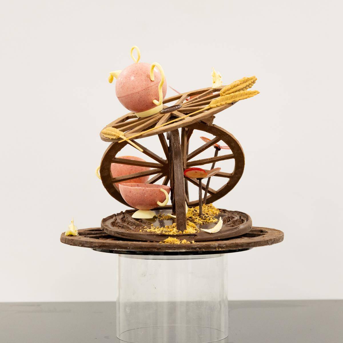 Edible components - Rice Crispy and Toasted Almond Dark Chocolate base, chocolate wheels, White Chocolate and Raspberry Tea Cup and Pot, Gold Wheat Sheaf Pods, Gold Chocolate for the Wheat Stems, White Chocolate Feathers and leftover elements from previous assignments within the piece- crumble, caramel/fudge, ganache
