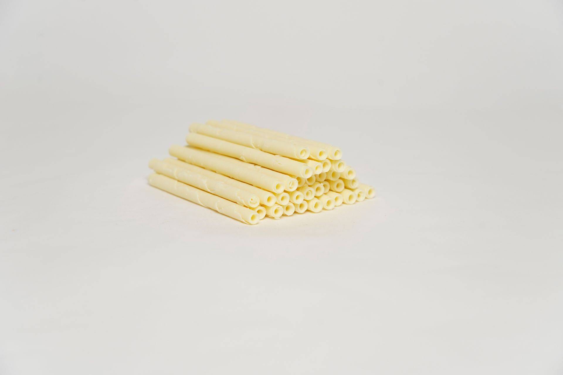 Our White Original Ivory Rolls capture the refined elegance of Callebaut chocolate in bar form. These expertly crafted white chocolate bars showcase the refined ivory character of authentic white chocolate. Measuring 107 mm, these decorations are meticulously crafted to have the same remarkably precise straight edges and solid construction as their dark counterparts, while delivering the creamy, velvety sweetness and subtle vanilla notes that define exceptional white chocolate artistry. Professional pastry chefs and chocolatiers value these pristine decorative elements for their ability to add vibrant contrast and sophisticated brightness to dessert presentations. Their ivory-white colour creates a visually striking balance when paired with darker elements, making them particularly popular for wedding cakes, elegant celebrations and contemporary plated desserts, where colour contrast is paramount. Whether positioned as an elegant architectural statement, arranged to create clean geometric lines, or used to add refined height and structure to delicate compositions, White Original Ivory Rolls transform desserts into luminous masterpieces that celebrate the pure elegance of fine white chocolate craftsmanship.