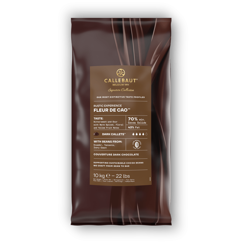 The diverse terroirs of Latin America and Africa come together beautifully in Callebaut's Rustic Fleur de Cao Dark 70% chocolate, which is made using carefully selected ingredients from both continents to create a product of remarkable complexity. This exceptional dark chocolate from our Signature Collection celebrates the unique characteristics that each region brings to cocoa cultivation, from the distinctive fruity profiles of Latin America's heritage varieties to the robust, earthy foundation of Africa's cocoa. The careful blending process brings together these different origins to create something greater than the sum of its parts. The tasting journey begins with a dominant roasted cocoa flavour, offering immediate depth and warmth. In the first half, roasted cocoa remains prominent, complemented by hints of spicy notes, and balanced by a sour and sweet taste. As the experience unfolds, the second half reveals a vibrant transformation: spicy, floral, and yellow fruit flavours come to the forefront, enriched by a lingering sweetness. This 70% cocoa creation offers exceptional versatility to professionals seeking depth and complexity, whether they are crafting ganaches, moulding or creating desserts that demand chocolate with genuine character. Rustic Fleur de Cao is a testament to the artistry of blending, consistently delivering excellence that honours the traditions and innovations of chocolate making.