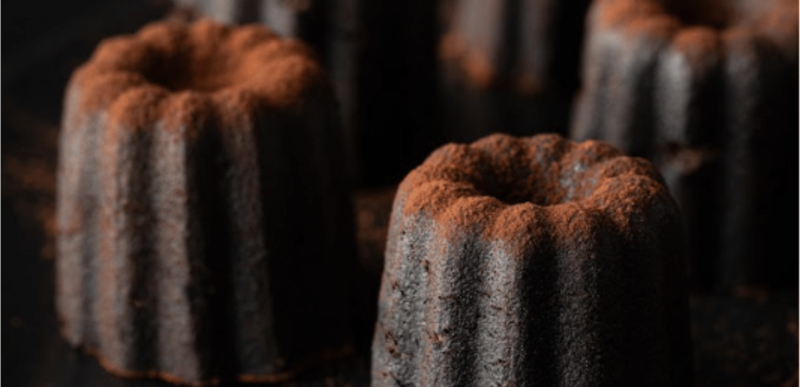 A Chocolate Canelé is a small French pastry flavoured with rum and vanilla, having a soft and tender custardy centre and a dark, thick outside crust.