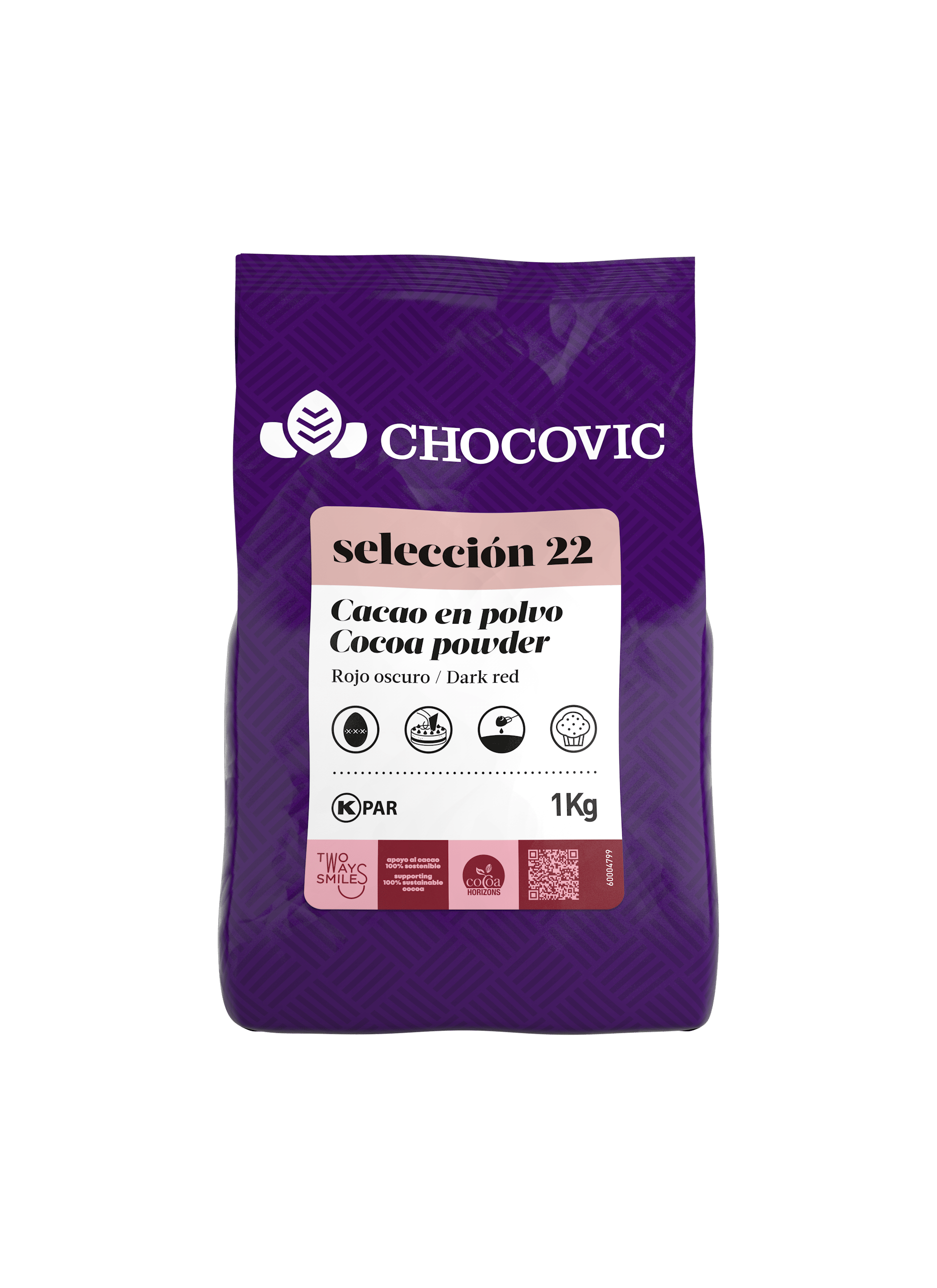 Selección 22 de Chocovic es un cacao en polvo alcalinizado de color rojo oscuro intenso con un contenido graso del 20-22 %.