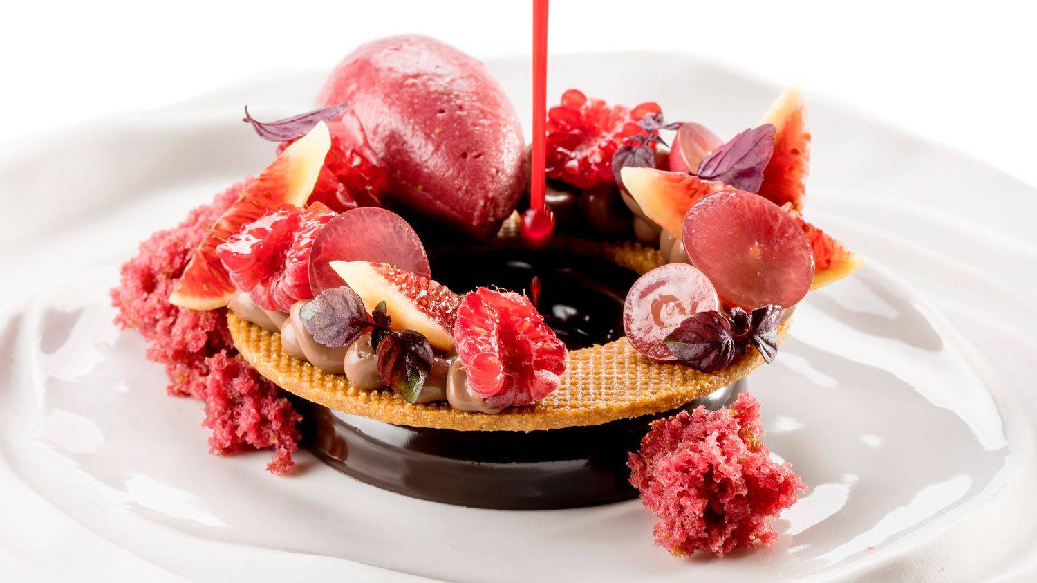 Coronar el postre con una canelle de sorbete de higo.