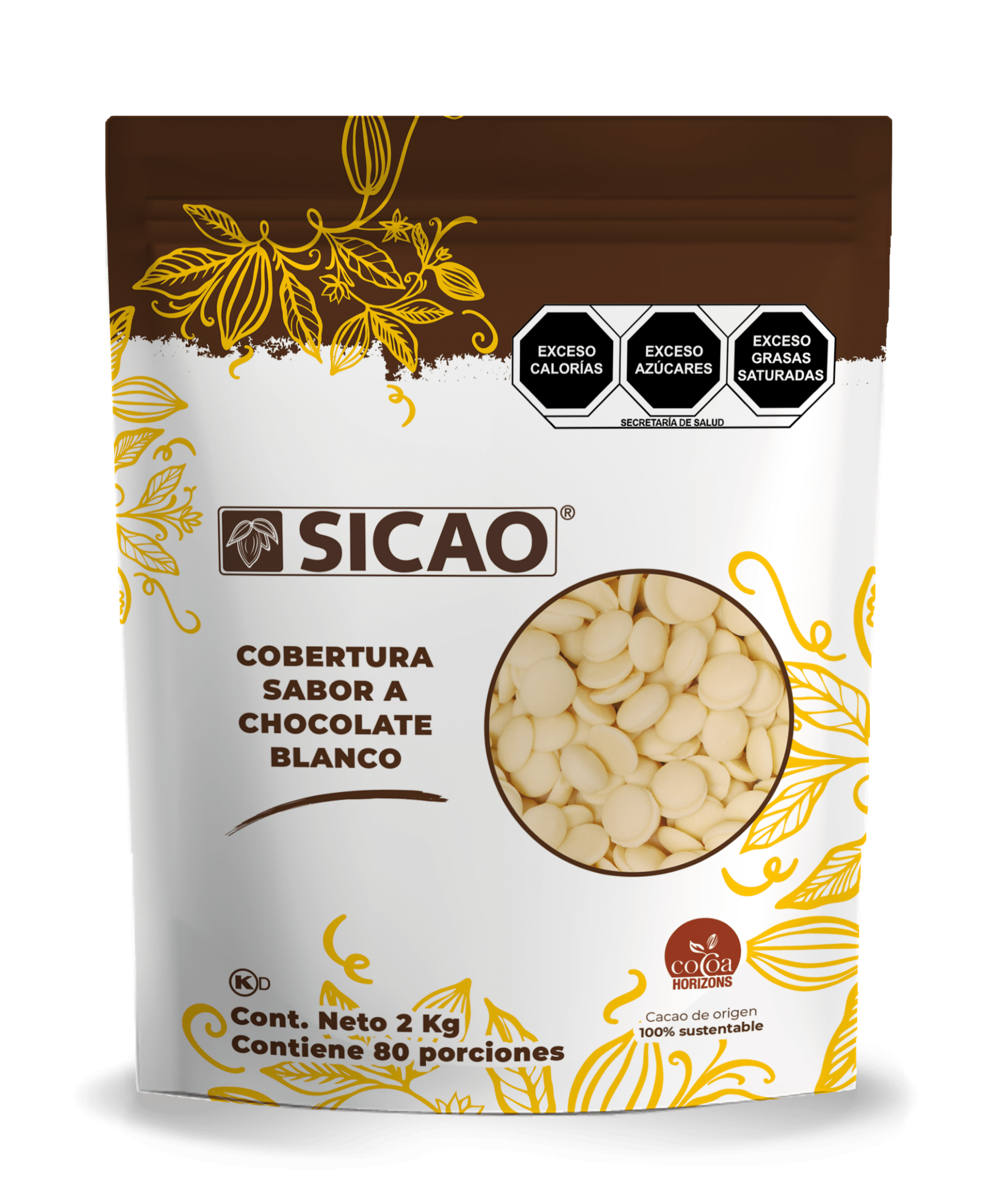 Cobertura sabor a chocolate blanco fácil de derretir, no requiere temperado y resiste altas temperaturas
