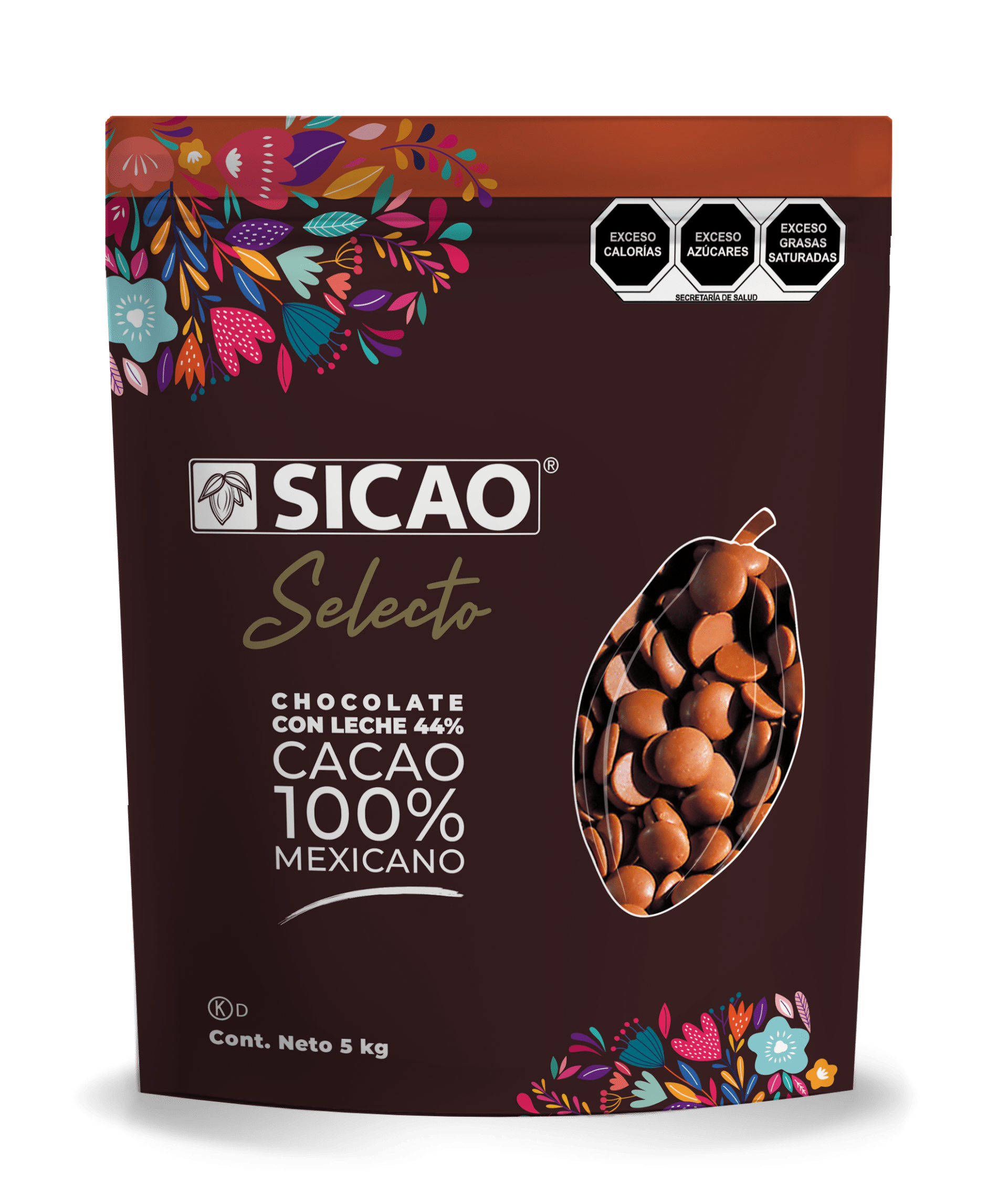 Chocolate con leche 44% cacao, con un sabor intenso a cacao con notas dulces, que es además cremoso y lácteo. Elaborado con cacao 100% mexicano. Nueva línea gourmet SICAO Selecto, la selección especial de SICAO.
