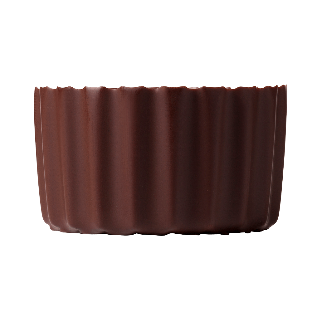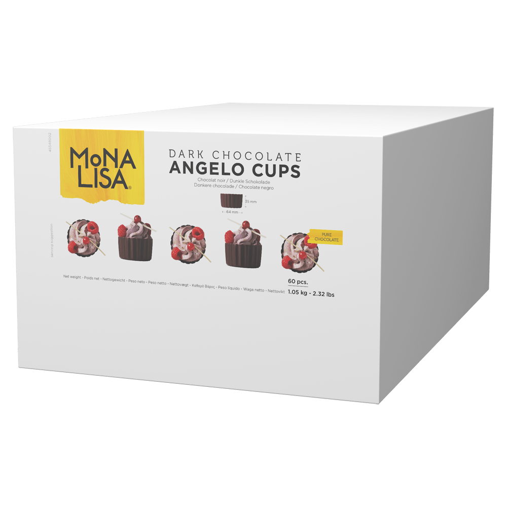 La coupe Angelo en chocolat de couverture noir (Ø : 64 mm, hauteur : 35 mm) possède des bords parfaitement arrondis. Une fois garnie de mousse, de crème ou de ganache et agrémentée de fruits et de copeaux de la gamme Mona Lisa, elle devient un dessert complet.