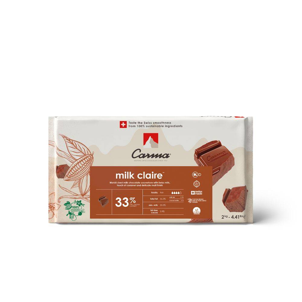 Milk Claire is a unique milk chocolate, crowned the “World’s Best Milk Couverture”. It boasts an exquisite blend of selected Swiss milk with a subtle caramel and malt finish. A smooth-melting chocolate with a beautifully delicate texture.