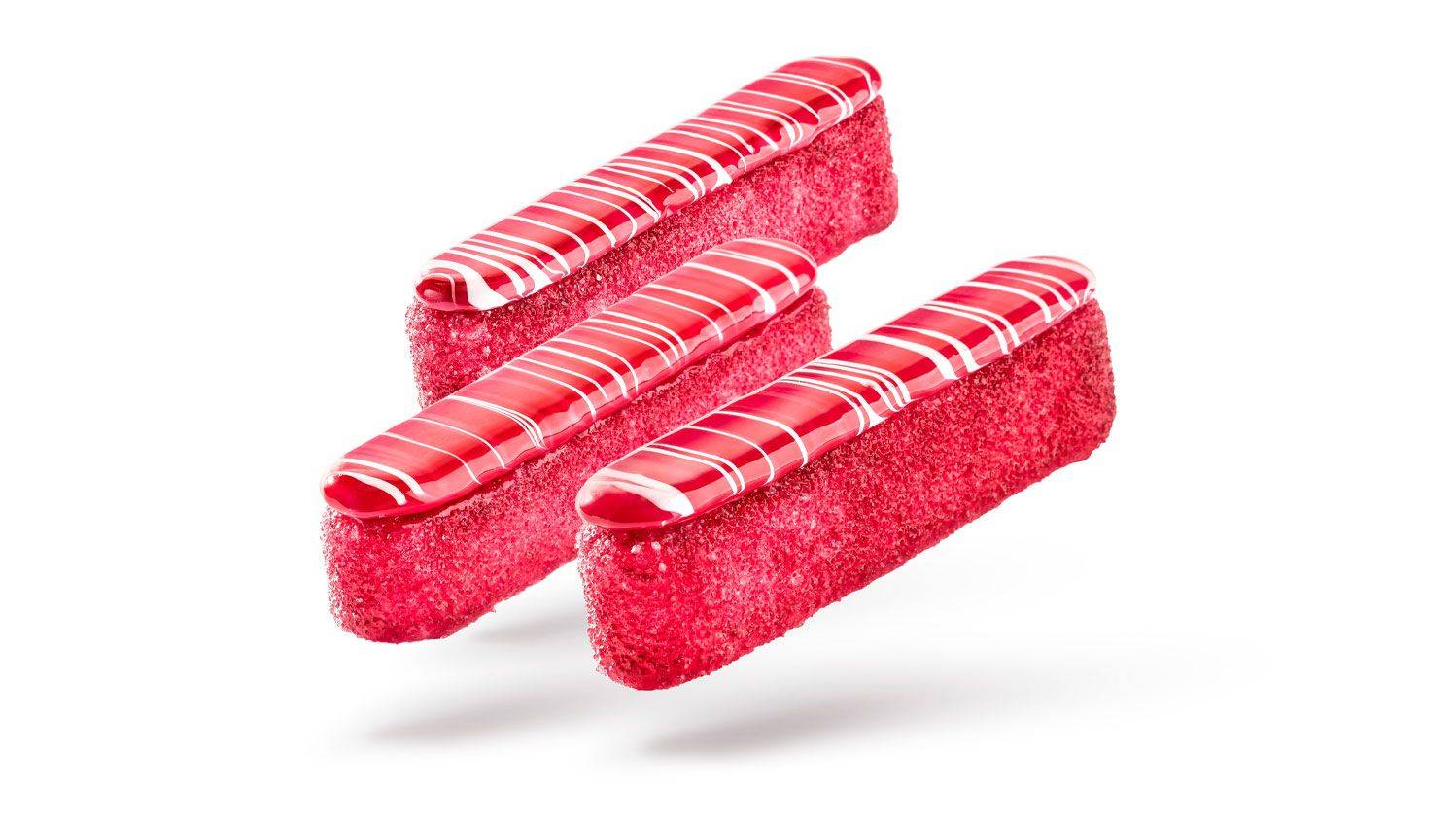 Fondre à 30°C la végétaline. Garnir le moule éclair*. Après refroidissement, réchauffer la surface et recouvrir celle-ci avec de la poudre de betterave et poudre de framboise mélangées à du sucre.