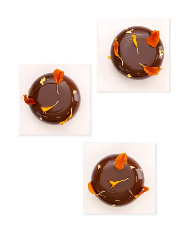 5. Madagascar (gf) - mus czekoladowy single origin Madagascar, compote mango-marakuja-yuzu, czekoladowe crumble, czekoladowy glasaż
