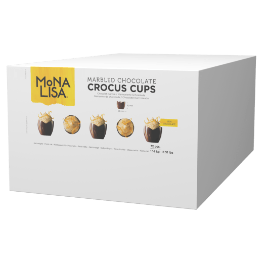 De tulpvormige cups van gemarmerde chocolade (D: 70, H: 64 mm) hebben een verfijnde afwerking en een rijke chocoladesmaak. Elke cup ziet er uniek uit dankzij een innovatief productieproces. U kunt hun rijke chocoladesmaak aanvullen met een vulling van crème, mousse of ganache. Een verpakking bevat 12 stuks; er is ook een verpakking per 36 stuks verkrijgbaar.