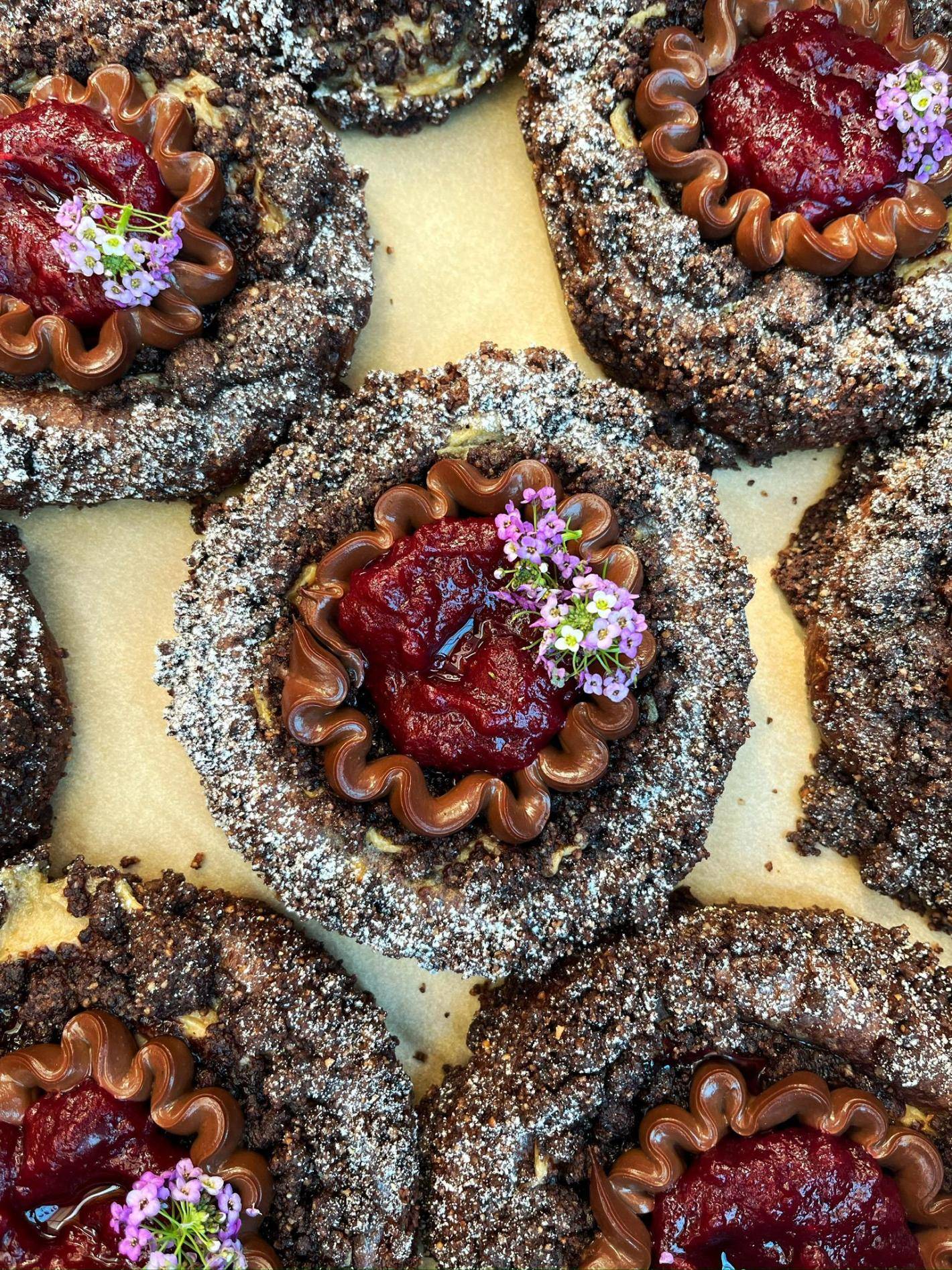 1. Drożdżówka z zapiekanym kremem pistacjowym, truskawkami, kruszonką pistacjową i kremem truskawkowym na czekoladzie ruby