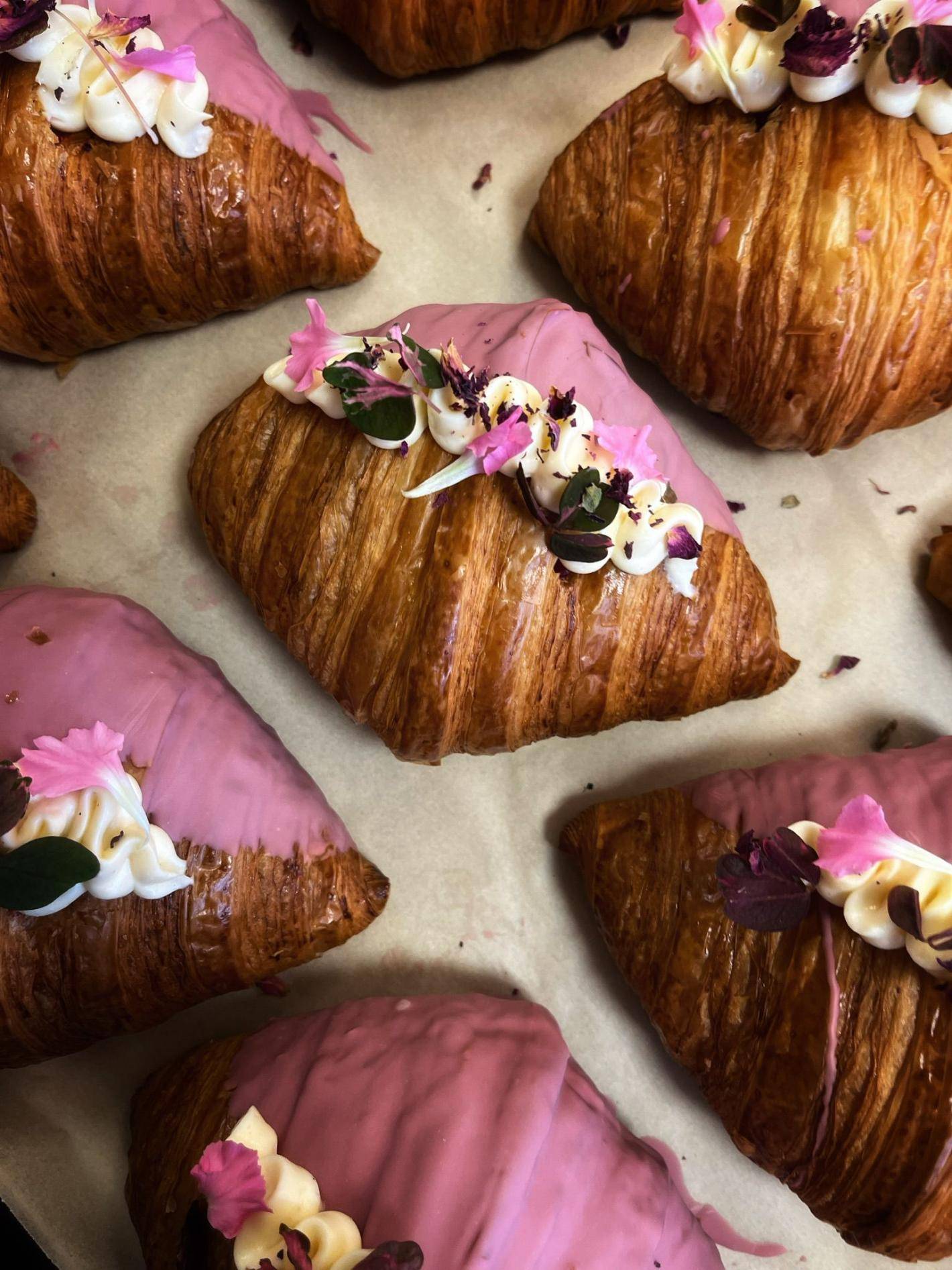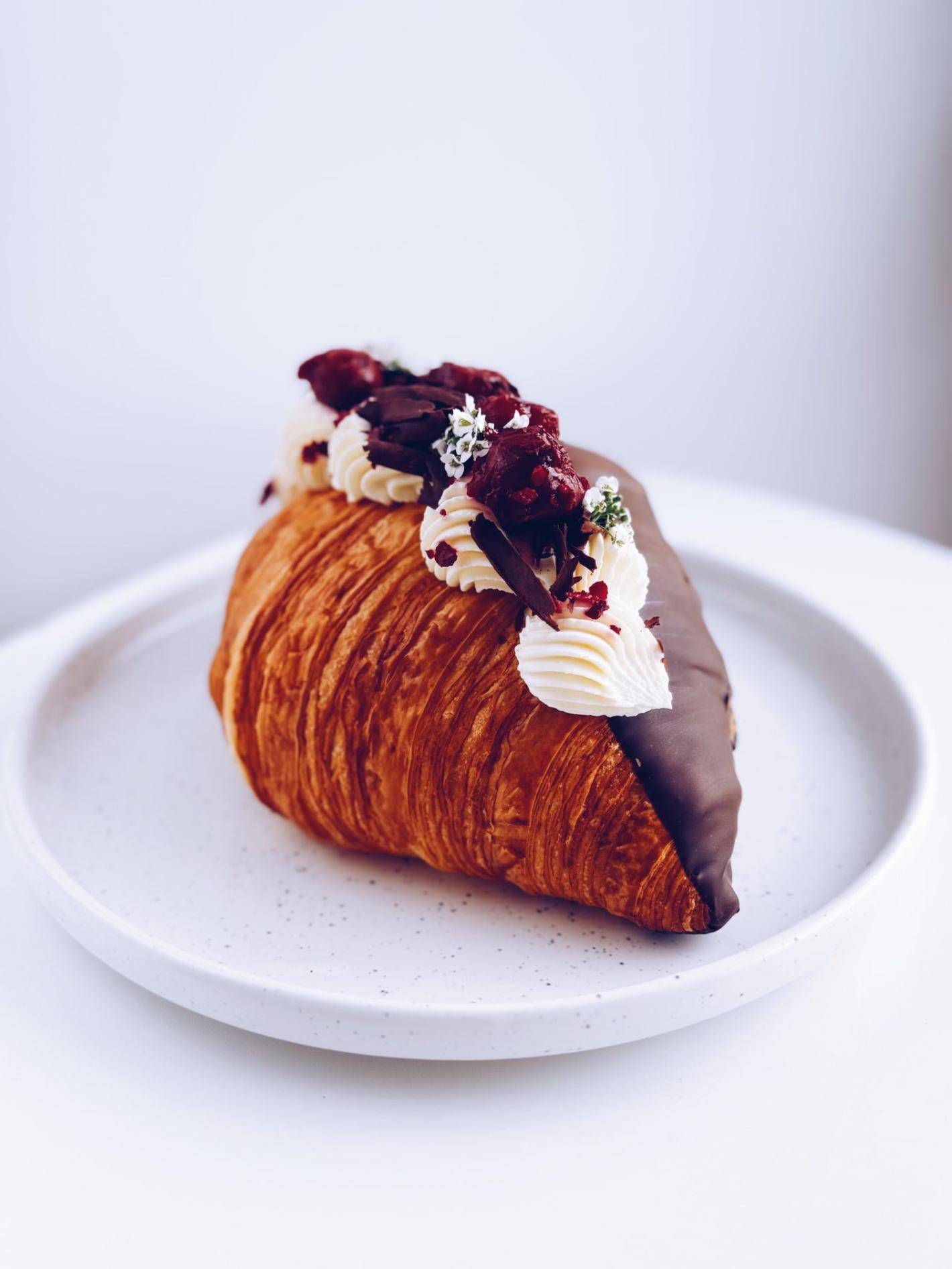 5. Croissant z jaśminowym kremem diplomat i konfiturą malinową zanurzony w czekoladzie ruby
