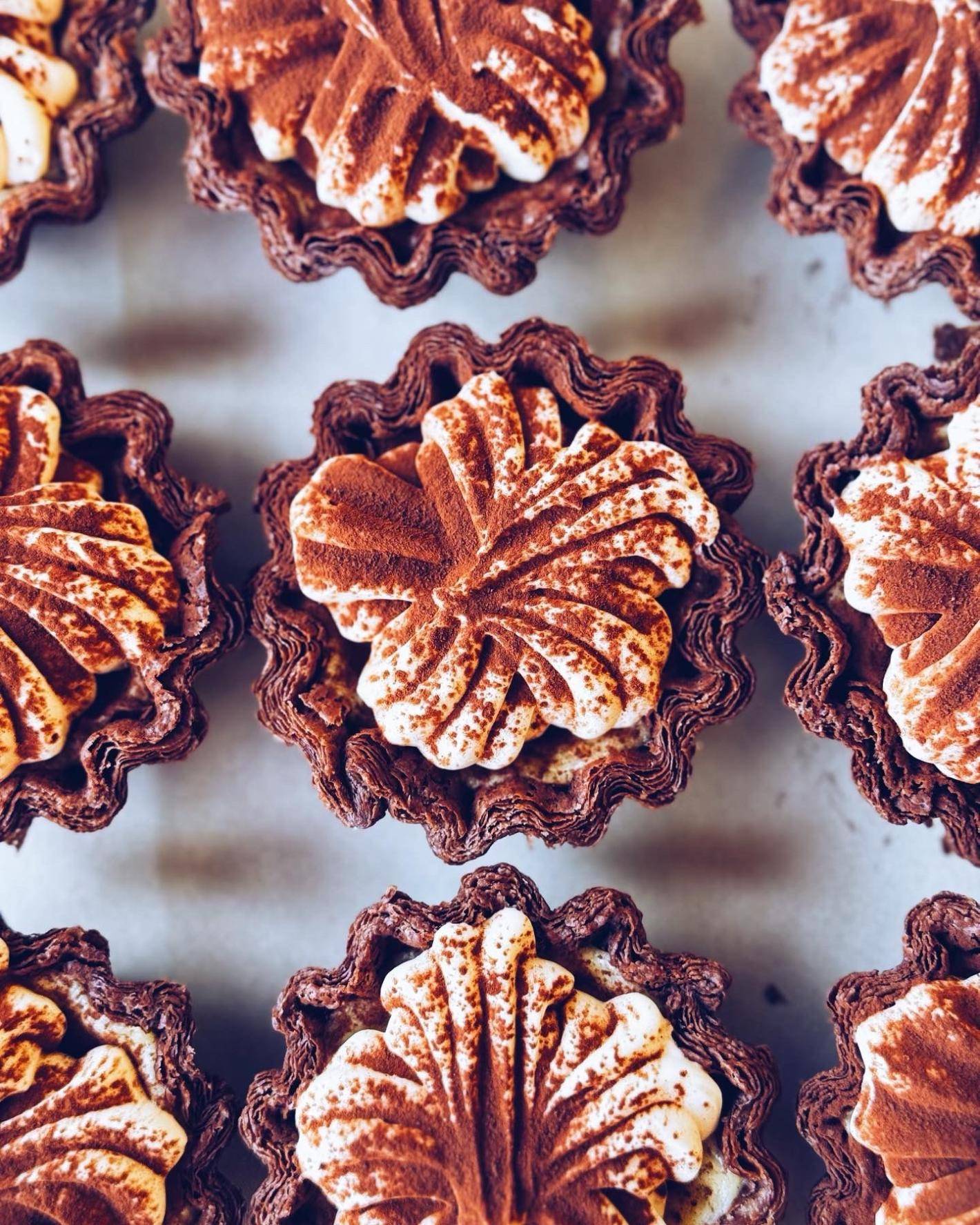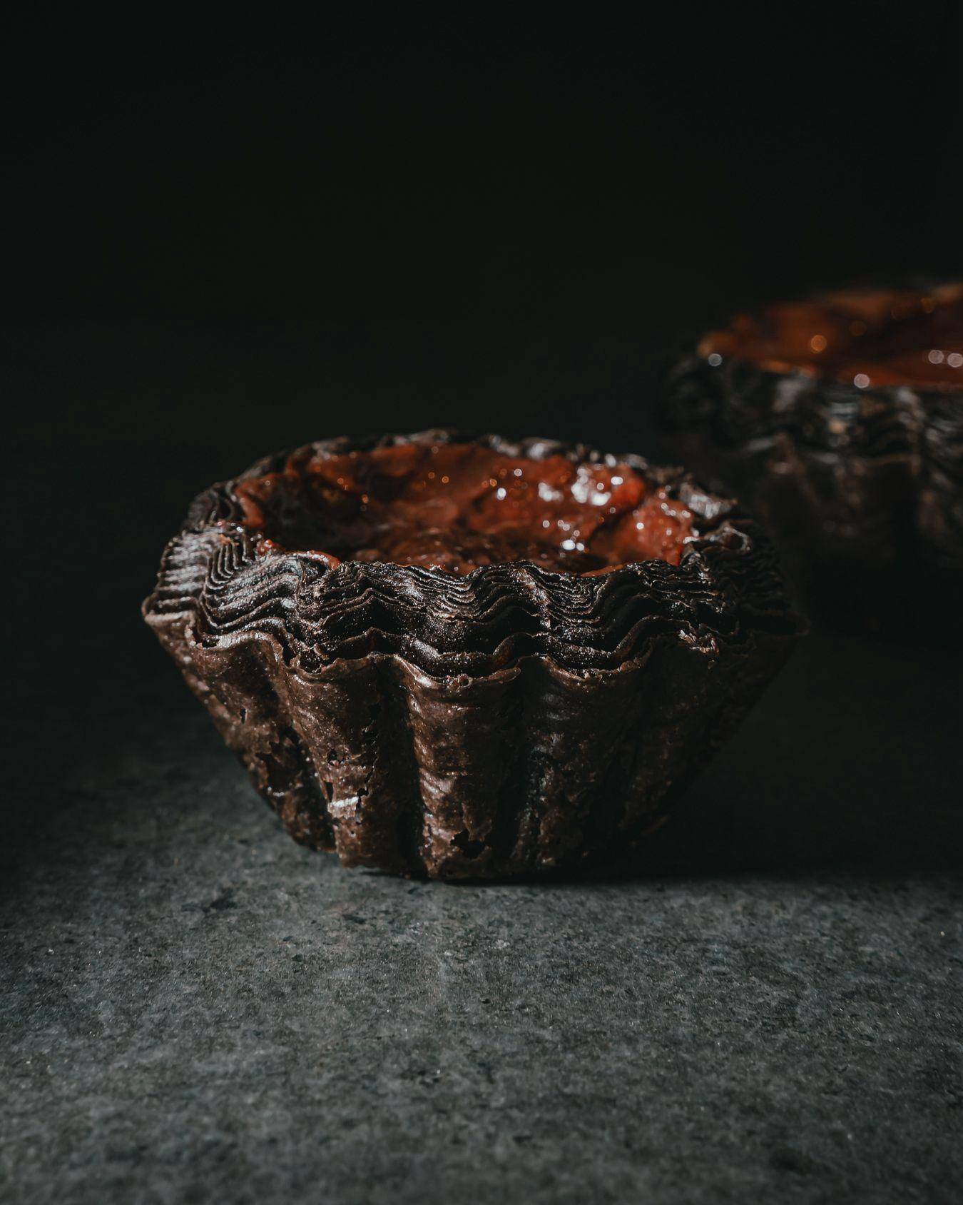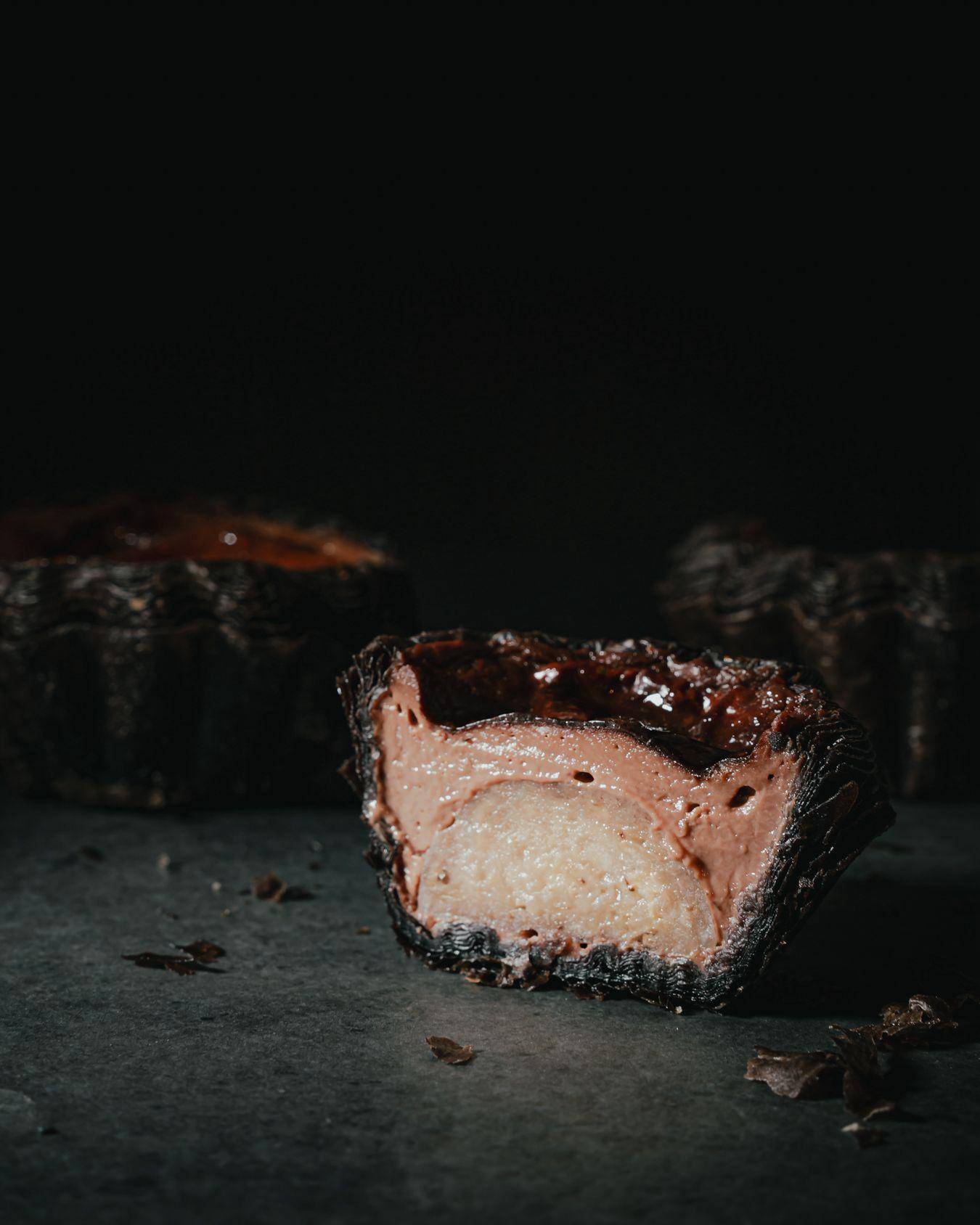 8. Flan kawowy w cieście czekoladowym z praliną migdałową i kremem mascarpone na pate a bombe