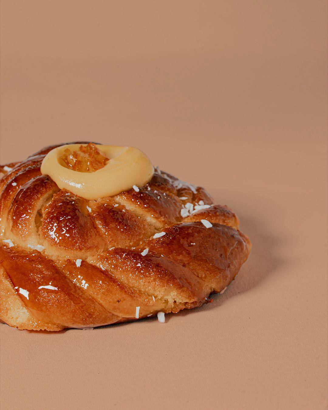 * Nadziewana brioszka z kokosowym kremem Patissiere na białej czekoladzie, konfiturą mango i kokosową kruszonką