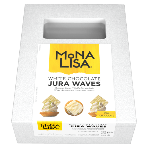 Dekoracje Kwadrat Jura Fala w 100% wykonane z ciemnej czekolady (dł.: 30, szer.: 30, wys.: 2 mm) są bardzo cienkie, a mimo to pełne smaku czekolady. Te dekoracje można zastosować do ciast i wyrobów cukierniczych, aby stworzyć teksturę. W ofercie Mona Lisa znajduje się także ta sama dekoracja w wersji z białej czekolady.
