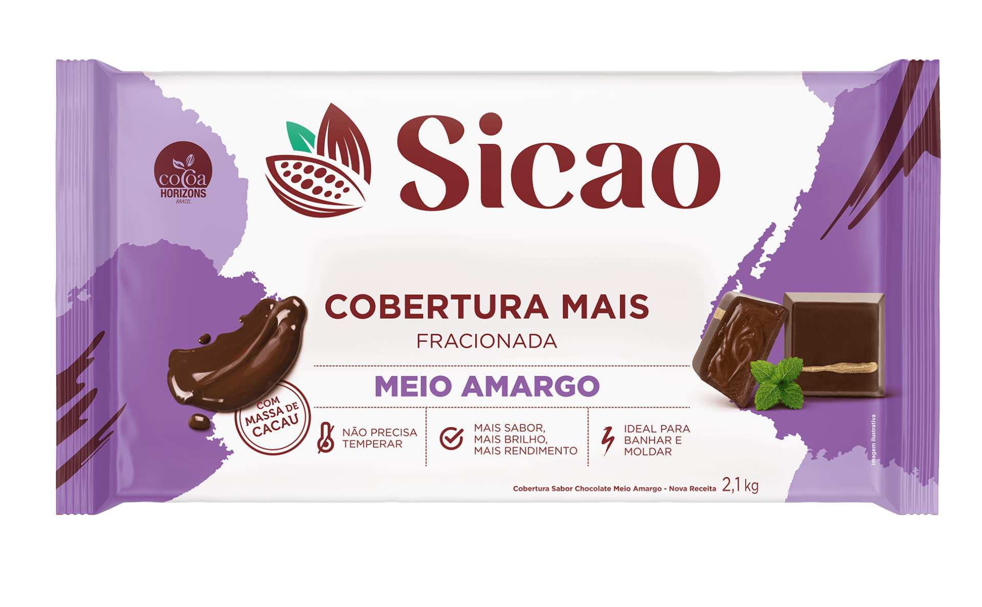Mais sabor, mais rendimento. A Cobertura Sabor Chocolate Meio Amargo Sicao Mais apresenta maior teor de cacau, com adição de liquor de cacau que garante sabor e cor mais intensos! Tem excelente fluidez, brilho marcante e o melhor rendimento do mercado.