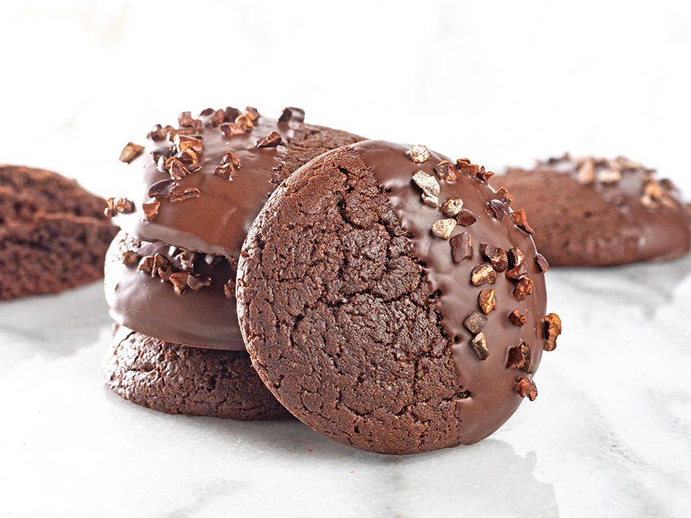 Banhe metade dos cookies e finalize com nibs de cacau