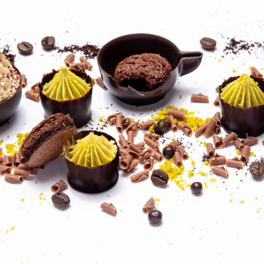 Небольшие чашечки Espresso из темного шоколада (д: 56 мм, ш: 44 мм, в: 21 мм) послужат идеальной основой для восхитительных фуршетных десертов. Эти чашки идеально дополнят вкус муссов на основе темного шоколада, кофейных кремов, тирамису и пралине.