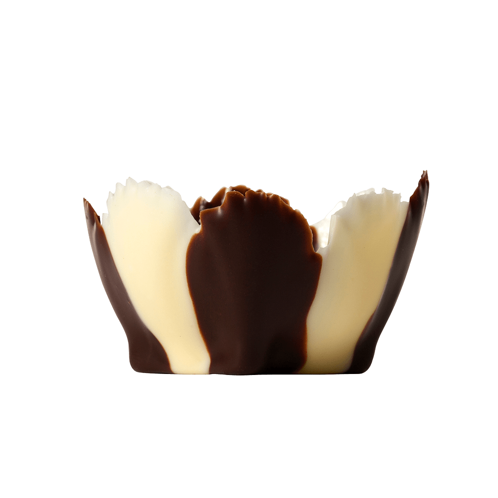 Чашечки из шоколада в виде цветка с тонкими неровными краями (ø: 27 мм, в: 26 мм). Выглядят так, будто сделаны вручную. Добавляйте какие угодно начинки: муссы, кремы, ганаш, карамель или даже мороженое.