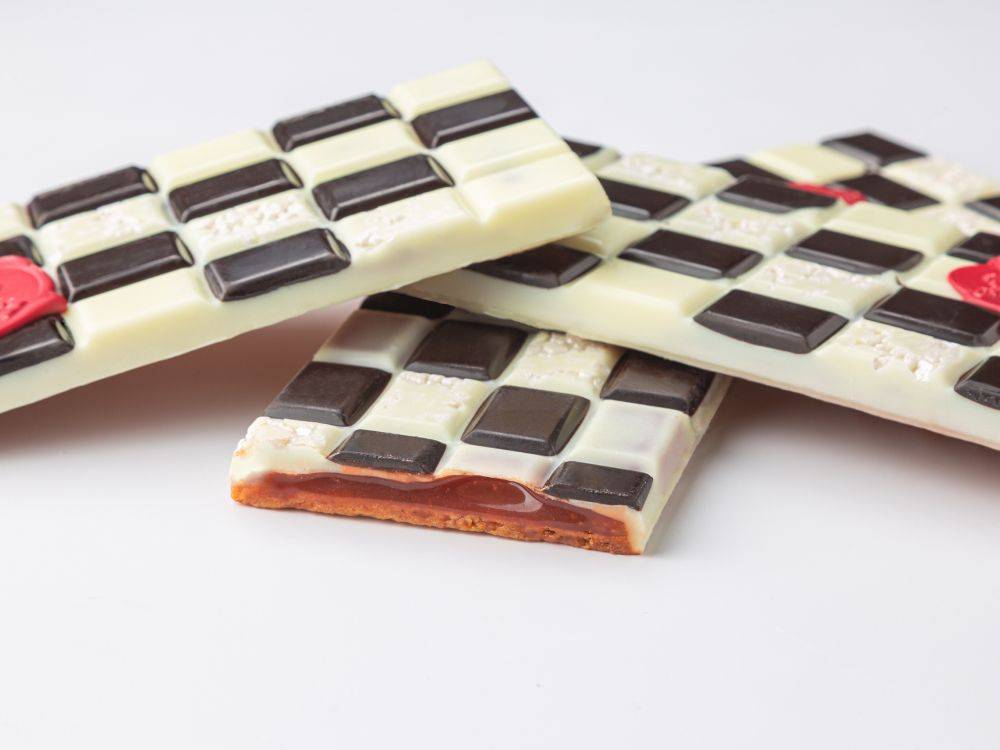 5. Отсадить в корпус плитки карамель, накрыть охлажденным сабле, края сабле закрыть темперированным белым шоколадом.